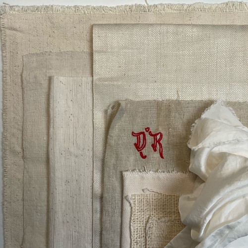 A stained vintage heavyweight handwoven linen with red monogram