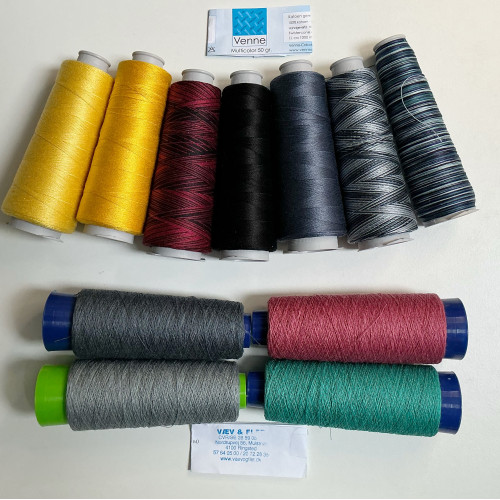 There are 7 shades of mercerised cotton Nm 40/2 or Nm 34/2 by Venne and 4 shades of linen  Nm 17 by Vaeveogflet
